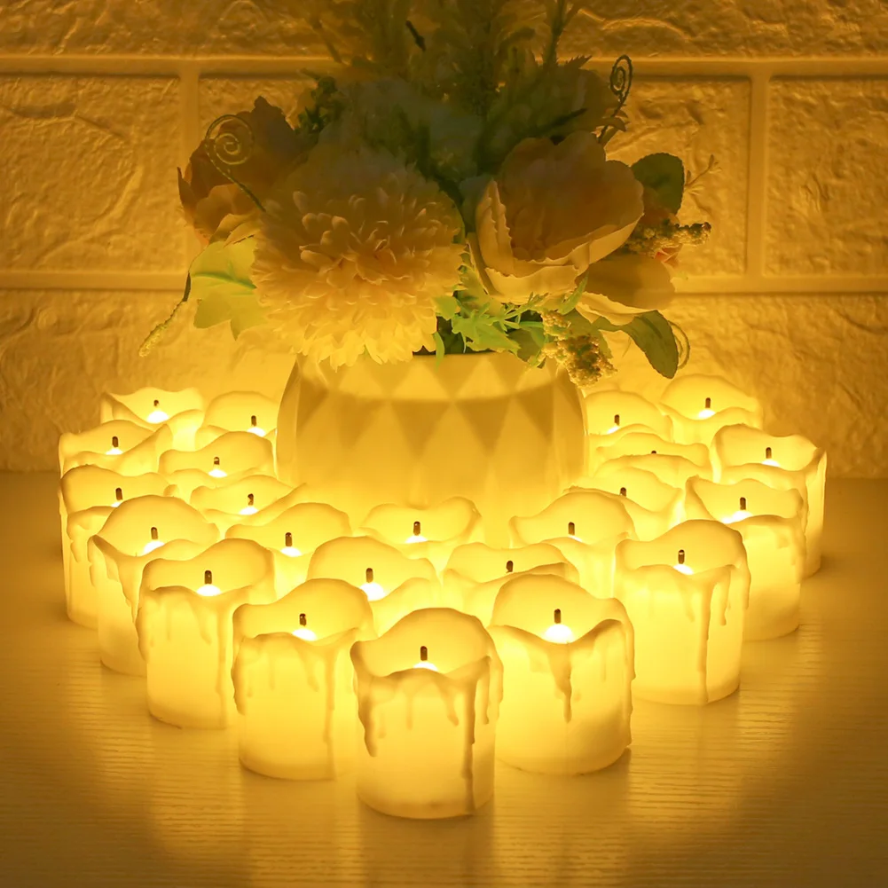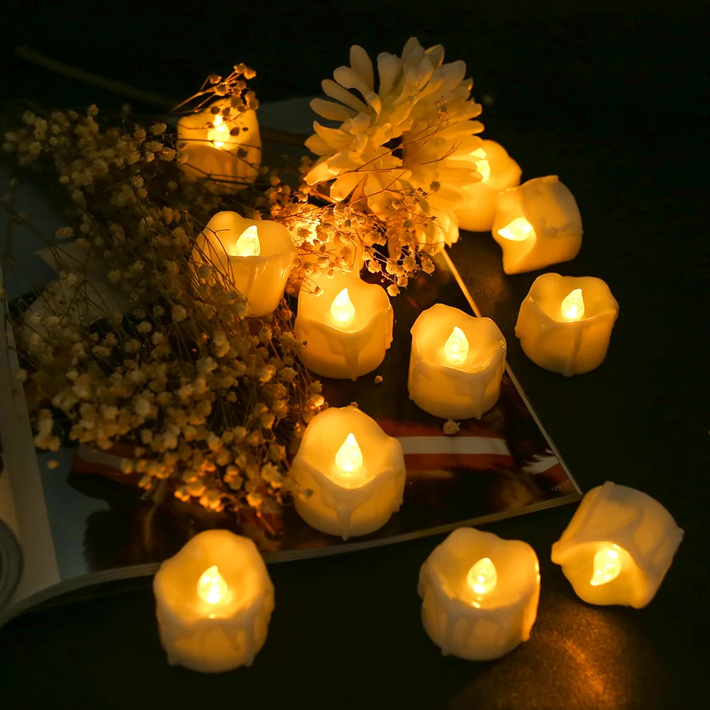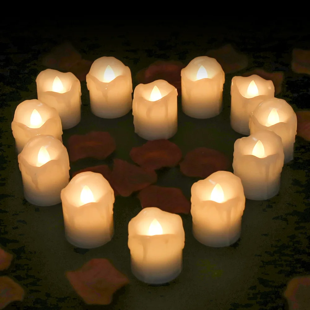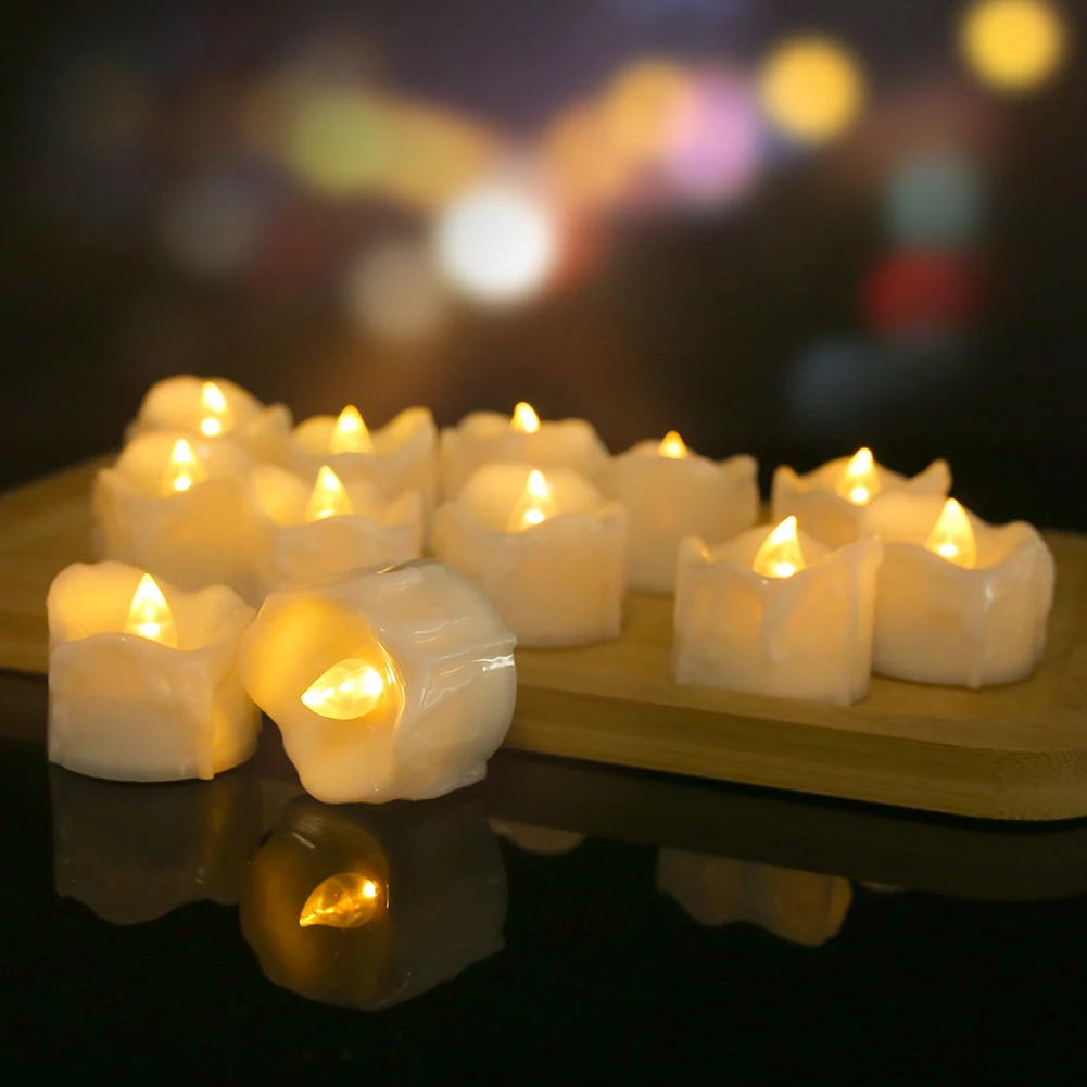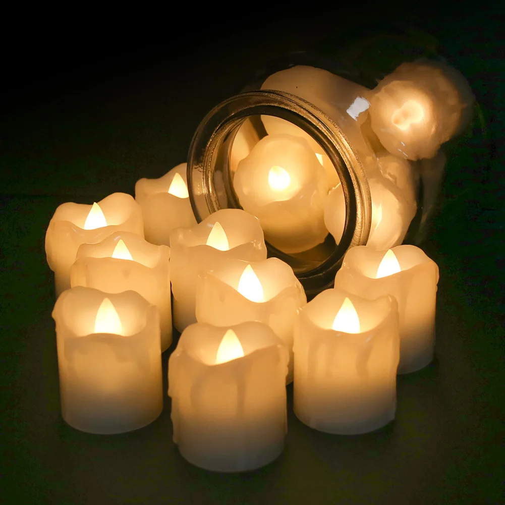 Realistic flameless LED tea lights in sets of 12 or 24, perfect for festive decor.
